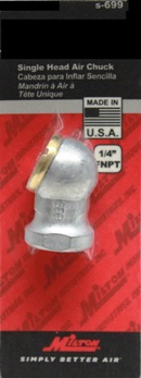 Milton s699 single head air chuck. Has 1/4"FNPT threads. Maximum pressure of 150psi. Not to be used on Milton inflator gauges. Made in the USA. WARNING:CANCER AND REPRODUCTIVE HARM see www.P65Warnings.ca.gov