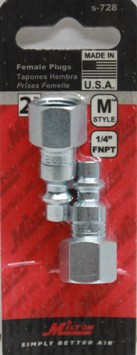 Milton s728 pk/2 Style M Female Plug. Has 1/4"FNPT threads. Maximum pressure of 300psi. Air flow 40scfm. Made in the USA. WARNING: CANCER AND REPRODUCTIVE HARM see www.P65Warnings.ca.gov